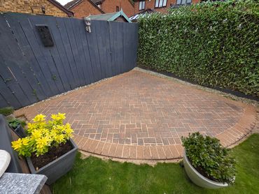 Brick-paved driveway with black metal gate and garden beds beside a brick house.